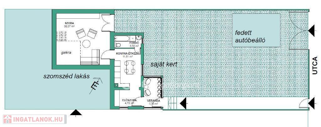 A kerten keresztül érkezünk a bejárati verandára, majd az előszobába. A lakásban egy jól felszerelt konyha-étkező, egy fürdőszoba és egy nagy méretű, nagy belmagasságú, alvó galériával kibővített szoba található. Innen egy terasz ajtón keresztül a kertbe juthatunk.